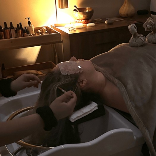 Réduction du stress et amélioration de la circulation du cuir chevelu. Comprend : shampooing, masque, aromathérapie, masque hydratant pour le visage et massage crânien.